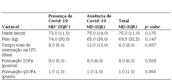Observou-se que os idosos internados em UTI por outras infecções respiratórias, exceto a Covid-19, apresentaram mediana de idade de 75 anos (IQR=14), e pesavam 65,0 kg (IQR=38). A mediana de dias de internação na UTI foi de 12 dias (IQR=13), e as pontuações calculadas de SOFA e qSOFA foram expressas nas medianas de oito pontos (IQR=6) e um ponto (IQR=1), respectivamente (Tabela 3).
