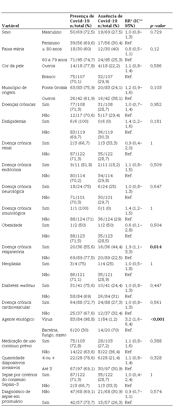 Resumo: Justificativa e Objetivos: as infecções em idosos são mais frequentes e graves e podem gerar sepse, que pode ser causa imediata de morte na Unidade de Terapia Intensiva (UTI). O objetivo do estudo foi compreender os fatores de risco associados ao óbito de idosos com sepse internados em UTI em decorrência de infecção respiratória comunitária prévia. Métodos: este é um estudo epidemiológico, descritivo e analítico. Foram analisados prontuários de idosos, internados na UTI de setembro de 2019 a setembro de 2020, com diagnóstico de infecção respiratória comunitária, que evoluíram para óbito devido à sepse, segundo a presença ou ausência de Covid-19. Foram coletados dados sociodemográficos e clínicos. Foi realizada análise descritiva e estatística. Resultados: a maior parte dos pacientes era do sexo masculino e possuía entre 60 e 79 anos. A presença de doença crônica respiratória (RR=1,9; p=0,014) e a etiologia viral (RR=3,2; p<0,001) estiveram associadas à morte. Conclusão: o resultado reforça a importância da prevenção de doenças respiratórias em idosos na comunidade, bem como a intervenção precoce para evitar o agravamento e o óbito.