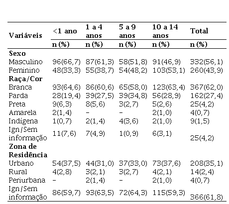 Durante o período de estudo, foram notificados 25.834 casos de TB no Paraná, destes 592 eram de TBI, sendo que 194 (32,8%) casos tinham idade entre 10 e 14 anos, seguido por 144 (24,3%) com idade inferior a um ano; 142 (24%) de um a quatro anos e 112 (18,9%) de cinco a nove anos. Ao analisar a caracterização sociodemográfica, houve predomínio do sexo masculino (66,7%), raça/cor branca (64,6%) para idade inferior a 1 ano e residente no perímetro urbano (37,6%) para idade entre 10 e 14 anos, 11 meses e 29 dias (Tabela 1).