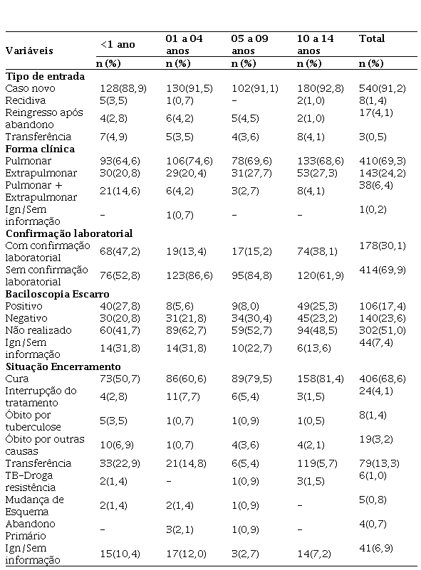 Considerou-se como variável dependente a faixa etária, categorizada da seguinte forma: menor que um ano; um a quatro anos; cinco a nove anos e 10 a 14 anos. Para a análise dos dados, utilizaram-se as variáveis sociodemográficas (sexo, raça/cor e zona de residência) e o perfil clínico (tipo de entrada, forma clínica, confirmação laboratorial, baciloscopia de escarro e situação de encerramento). A confirmação laboratorial foi constituída por meio da combinação de informações disponíveis nos campos relativos aos critérios de confirmação do caso “baciloscopia” coletado no site do DATASUS/SINAN.