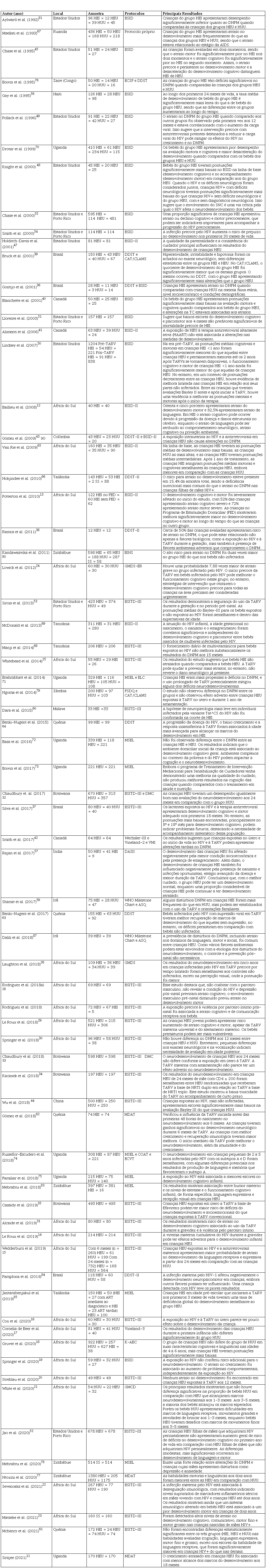 Dos 73 estudos incluídos nessa revisão de escopo, 51 (69,9%) avaliaram crianças infectadas com HIV e filhas de mães HIV positivas e em todos eles as crianças apresentavam atrasos significativos no DNPM, tanto em comparação às crianças HEU quanto HUU. Quando foram analisados os estudos que avaliaram o DNPM de crianças HIV negativas, mas filhas de mães HIV positivas, os achados foram controversos. Alguns estudos observaram alterações no DNPM das crianças HEU quando comparadas às HUU, enquanto outros não observaram diferenças entre o desenvolvimento de crianças HEU e HUU.