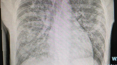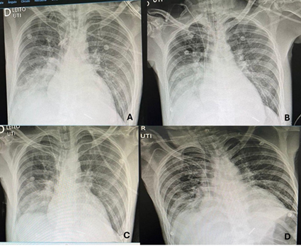 As imagens radiográficas apresentavam comprometimento intersticial difuso, opacificações alveolares nos campos pulmonares médios e na base à direita, além de aumento de área cardíaca (Figura 1).