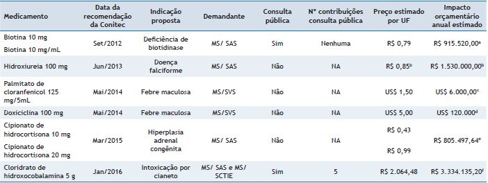Houve recomendações favoráveis à aprovação de medicamentos sem registro ativo em todos os anos de funcionamento da Conitec. As indicações de uso aceitas pela Conitec para os medicamentos foram as mesmas das agências sanitárias internacionais estudadas, para aqueles que nestas possuíam registro. Todas as demandas foram internas e oriundas de Secretarias do próprio MS. Apenas dois medicamentos tiveram sua recomendação de incorporação submetida à consulta pública, em ambos os casos obedecendo ao período estabelecido em lei, uma das quais não recebendo qualquer contribuição; os demais casos foram objeto de processo simplificado. Os medicamentos com maior impacto orçamentário estimado foram o cloridrato de hidroxocobalamina 5 g, hidroxiureia 100 mg e biotina 10 mg e 10 mg/mL, respectivamente (Tabela 2). Todas as recomendações da Conitec de incorporação foram acatadas pelo secretário da SCTIE.