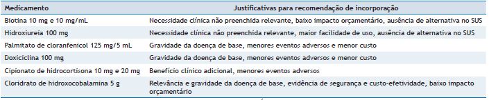 A incorporação de três medicamentos — biotina 10 mg, hidroxocobalamina 5 g e do cipionato de hidrocortisona 10 mg e 20 mg — foi recomendada para indicações que, até então, não eram cobertas pelas alternativas terapêuticas existentes no SUS ou que obrigavam, para atendimentos dos pacientes que necessitavam dos tratamentos, de formulações magistrais.