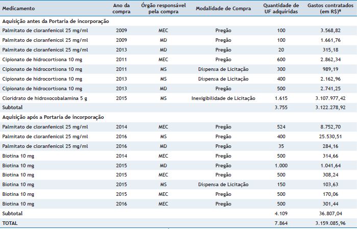 O volume de compras, em termos de quantitativos adquiridos como de dispêndios, não foi muito expressivo. Biotina e hidroxocobalamina destacam-se em termos de unidades farmacotécnicas adquiridas. Todas as 3.165 unidades da biotina foram adquiridas como apresentações magistrais junto a farmácias de manipulação nacionais, mesmo após sua incorporação pelo SUS. No caso da hidroxocobalamina, que representou 98% do total de gastos, foi realizada uma única aquisição pelo MS de 1.615 unidades do produto liofilizado, via importação, ao valor unitário do kit para infusão de R$ 1.810,55 em valores correntes de 2015. Foi prevista a aquisição por importação, a partir da compra centralizada pelo MS, tomando por base o disposto no Decreto n° 8.077/2013, em que a Anvisa pode dispensar de registro imunobiológicos, inseticidas, medicamentos e outros insumos estratégicos quando adquiridos por intermédio de organismos multilaterais internacionais, para uso em programas de saúde pública pelo Ministério e suas entidades vinculadas7. Como a empresa Merck® era única produtora, sua aquisição ocorreu mediante inexigibilidade de licitação, o que em certas situações pode tender a elevar de forma significativa os custos, dada a situação de monopólio comercial37.