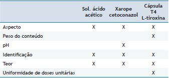 Results: Positive identification for acetic acid with 98.20% content compatible with glacial acetic acid, in disagreement with the prescription of 5% solution. The ketoconazole content of 16.20 mg/mL found in the syrup corresponds to 81.00% of the declared value, the minimum specification is 90.00%; pH 8.0; positive identification for anionic surfactant component in the syrup. The results found for T4 capsules were 177,70 μg for 25 μg capsules and 174, 44 μg for 200 μg capsules, corresponding to 710,96% and 87,22% of the declared content, respectively, in disagreement with the specifications of 90.00% and 110.00%.