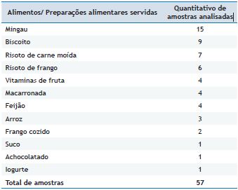 Ao total foram analisados 57 alimentos/preparações alimentares servidos (Tabela 1), sendo analisado um cardápio aleatório por escola.