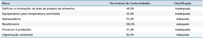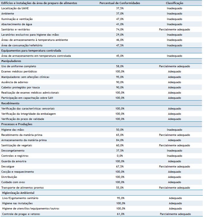 Itens críticos durante o processamento de alimentos como sanitização de vegetais, descongelamento adequado, dessalgue e tratamento térmico adequado receberam percentuais de conformidade de 60,0%, 37,5%, 67,5% e 100,0%, respectivamente. Falhas nesses itens podem comprometer a inocuidade da alimentação servida, haja vista que podem permitir a sobrevivência ou multiplicação de micro-organismos patogênicos28.