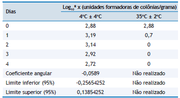 Após a análise de tendência do gráfico (Figura 1), constatou-se que o lote não foi suficientemente estável na temperatura de 35 ± 2ºC, pois é possível observar claramente o decréscimo da concentração celular já no segundo dia, ocorrendo no terceiro dia ausência de crescimento no volume plaqueado. Isso pode ter ocorrido devido a ação de componentes da matriz sobre o micro-organismo, uma vez que outros estudos com outras as matrizes queijo e carne bovina foram considerados suficientemente estáveis a 35 ± 2ºC13,14,16,18. Na temperatura de 4 ± 4ºC, como não foi evidenciada tendência na análise do gráfico (Figura 1), foi realizado o teste de regressão linear, e o lote foi considerado suficientemente estável uma vez que o intervalo de confiança a 95% abrange o valor zero (Tabela 2). Em matriz queijo, Costa et al.13 avaliaram um lote de IE para Salmonella spp., durante seis dias, identificando que esse foi estável a 4ºC ± 4ºC e 35ºC ± 2ºC. Também em matriz queijo, Brandão et al.18 estudaram em seis dias a estabilidade dos lotes de IE produzidos para coliformes, verificando que esses foram suficientemente estáveis a 4ºC ± 4ºC, 25ºC ± 2ºC e 35ºC ± 2ºC.