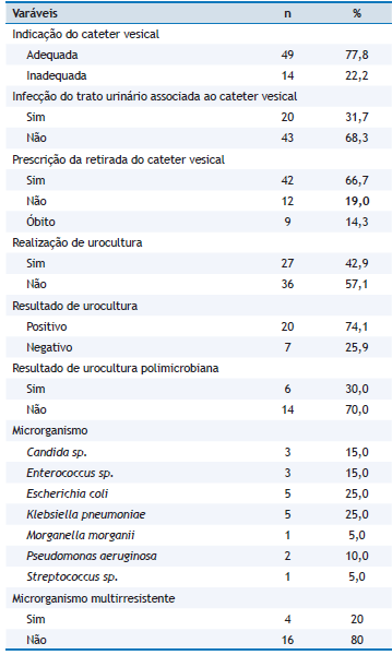Para caracterização dos pacientes, de acordo com as variáveis relacionadas à indicação do CV, diagnóstico de ITU e análises microbiológicas, a Tabela 2 apresenta a frequência simples e percentual da análise descritiva.