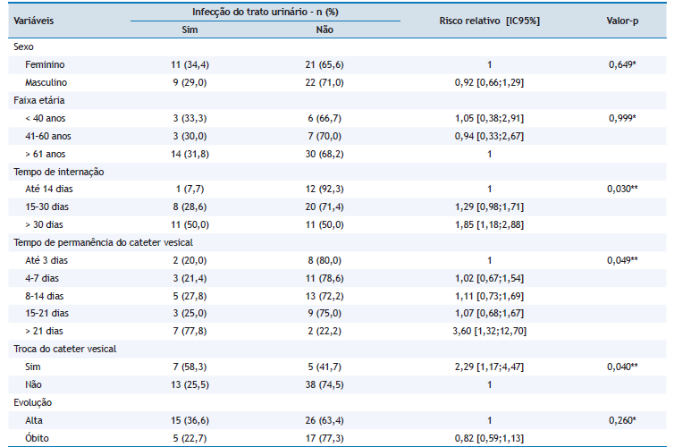 De acordo com os resultados apresentados na Tabela 3 , houve associação significativa entre a ocorrência de ITU e o período de internação e tempo de permanência do CV. Os pacientes com maior risco de ITU foram aqueles com mais de 30 dias de internação, mais de 21 dias de permanência do CV e que tiveram troca do CV.