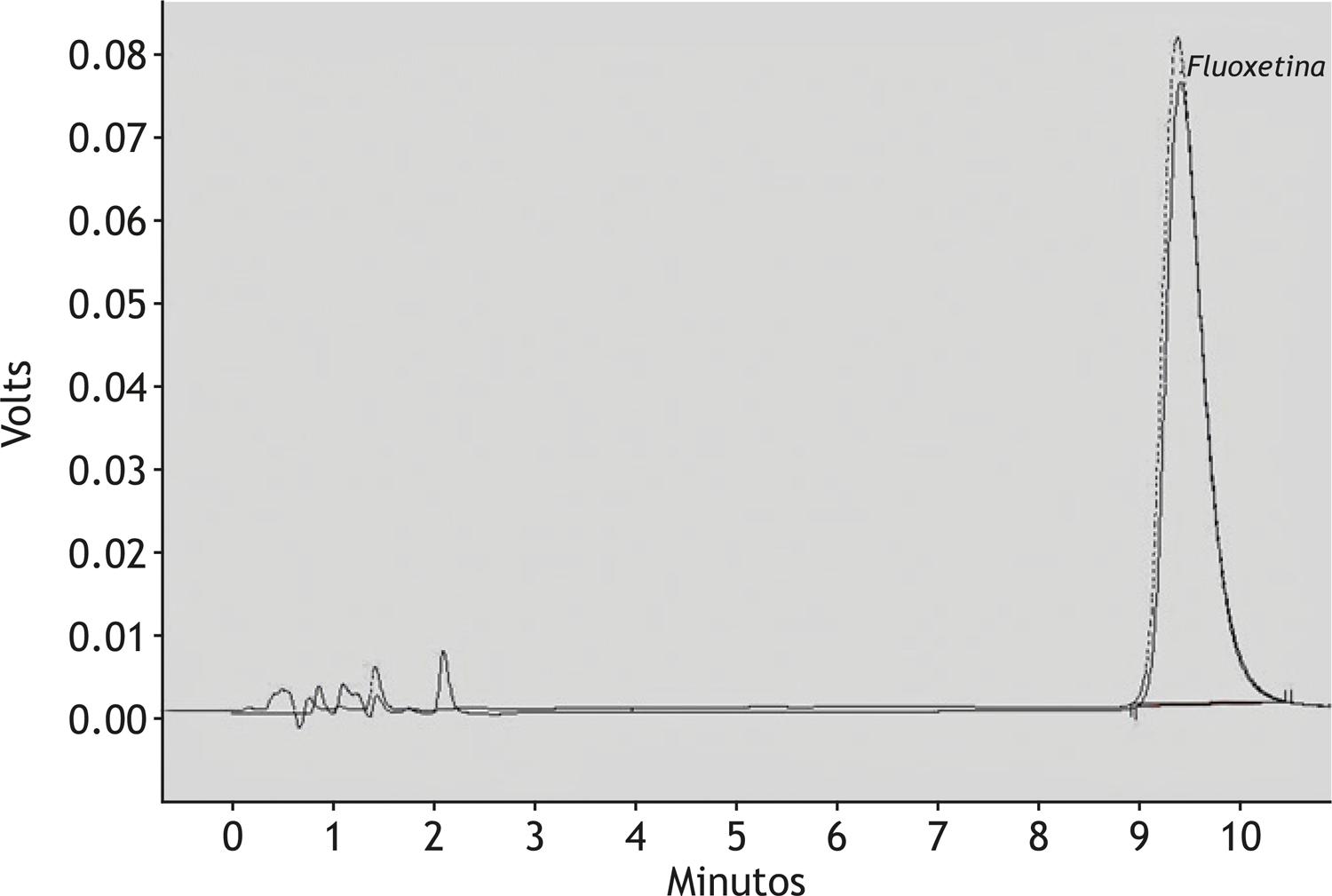 A análise de teor de princípio ativo é feita por cromatografia líquida de alta eficiência (CLAE) ( Figura ). No ensaio da fluoxetina, foi realizada mistura do conteúdo de cinco cápsulas.