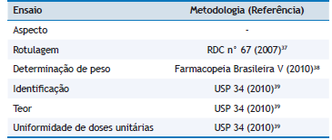 Para a avaliação da qualidade físico-química dos medicamentos foram realizados os ensaios farmacopeicos de determinação de peso, identificação, teor e uniformidade de doses unitárias36 , 37 .