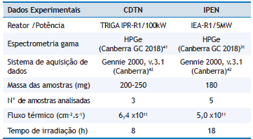 Já a determinação das impurezas inorgânicas foi realizada no Centro de Desenvolvimento da Tecnologia Nuclear (CDTN) e no Instituto de Pesquisas Energéticas e Nucleares (IPEN) em São Paulo/SP usando a técnica de análise por ativação neutrônica (AAN)23 . Os parâmetros experimentais utilizados em cada laboratório estão descritos na Tabela 2 . A principal vantagem da AAN é a possibilidade de determinação de vários elementos simultaneamente com menor custo e tempo de trabalho23 .