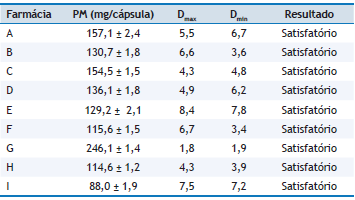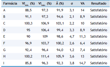 Comparando-se os resultados do valor de aceitação entre as amostras dos diferentes estabelecimentos, pode-se observar que, apesar de satisfatórias nesse ensaio, as amostras correspondentes as farmácias A e I apresentaram os valores mais próximos do limite aceitável (VA < 15). Tal fato pode ser explicado devido ao fato de as unidades testadas apresentarem teor menos homogêneo. As amostras das farmácias A e I foram reprovadas neste ensaio.