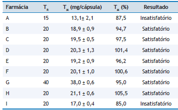 Em relação ao ensaio de teor, apresentado na Tabela 4 , pode-se observar que as amostras das farmácias A e I foram insatisfatórias. As amostras consideradas insatisfatórias, com teor de princípio ativo inferior a 90% do valor declarado é um resultado preocupante porque pode levar à ineficácia do tratamento farmacológico, com ausência ou modificação da resposta terapêutica esperada a partir do uso desses medicamentos38 , 44 . Pela legislação sanitária vigente são necessárias, para preparações magistrais sólidas, análises de descrição, aspecto, caracteres organolépticos e peso médio. Não é requerido ensaio de teor na rotina de manipulação dessas preparações.