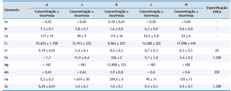 Observou-se que, considerando os limites de ingestão especificados pelo European Medicine Agency (EMEA) para alguns elementos como Cr, Fe, Mn e Zn, todas as amostras apresentaram concentrações inferiores e estariam satisfatórias37 , 45 .