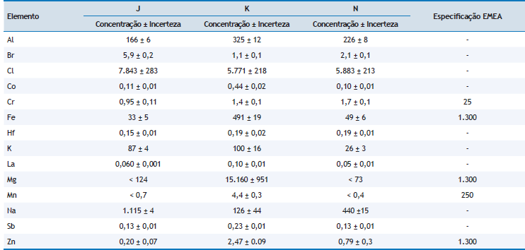 Os resultados da investigação da presença de impurezas inorgânicas utilizando a técnica AAN36 estão apresentados nas Tabelas 6 e 7 . Por limitações de ordem logística não foi possível realizar as análises nos dois laboratórios com o mesmo conjunto de amostras. Esse fato confirma a heterogeneidade das amostras e explica as diferenças observadas nos resultados dos dois laboratórios para as concentrações de um mesmo elemento em diferentes amostras da mesma farmácia.