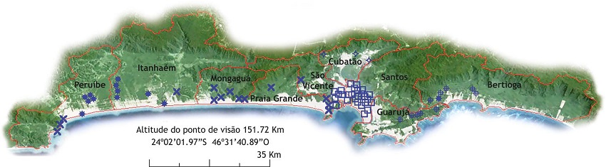 Poços (Bertioga, Itanhaém e Peruíbe). Software utilizado para construção da figura: Photoshop. Imagem extraída do ‘site’ Google Earth (https://www.google.com.br/intl/pt-BR/earth/).