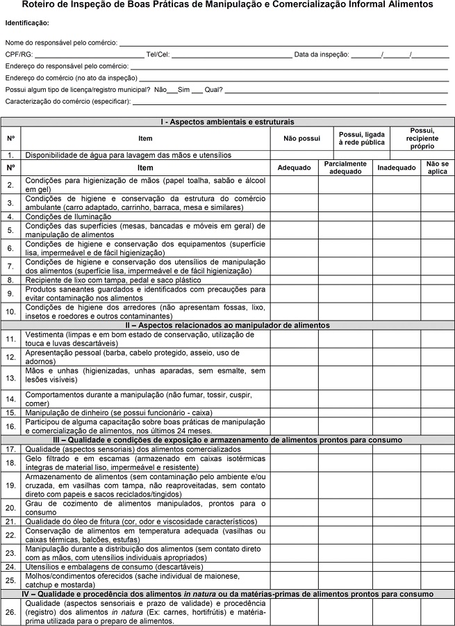 O roteiro para inspeção do comércio informal de alimentos incluiu uma ampla variedade de questões que versam sobre aspectos ambientais e estruturais do comércio, do manipulador de alimentos e da qualidade, condições de exposição e de armazenamento dos alimentos. O instrumento mostrou-se de fácil aplicação e adequado para avaliar a manipulação e a comercialização de alimentos em diferentes tipos de comércios informais em vias públicas ou locais similares.