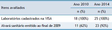 A proposta de Licenciamento Sanitário iniciado em 2010 com notificação para atualização de cadastro junto ao órgão sanitário obteve como resultado a ampliação do controle regulatório da atividade laboratorial conforme mostra a Tabela 1 , na qual pode ser observado que, de um total de 62% de laboratórios licenciados em 2010, passou-se para 92% em 2014.