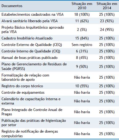 Método: O trabalho foi desenvolvido em quatro etapas em paralelo ao Licenciamento Sanitário Anual. Em 2010 foi realizada a primeira fase de recadastramento dos estabelecimentos e a apresentação do dossiê técnico existente nos estabelecimentos. Em 2011, ele se estendeu com a análise, revisão, correção e aprovação dos documentos legais e técnicos. Já em 2012 foram reavaliados os manuais, os planos de controle de pragas, de gerenciamento de resíduos, de controle dos insumos e da presença de controle da qualidade interno e externo além do fluxo para notificação de doenças compulsórias já em aplicação nos estabelecimento. Em 2013 foram exigidas a apresentação e a implementação das ações de gerenciamento da qualidade e, em 2014, intensificou-se o monitoramento da aplicação destas ferramentas.
