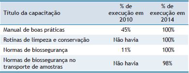 A evolução na perspectiva dos cuidados sanitários nos laboratórios também é demonstrada na Tabela 3 , uma vez que as exigências documentais, em conjunto com o processo de assessoramento da construção, aprovação e aplicação destes procedimentos, estimularam o empenho dos profissionais graduados e dos técnicos no estabelecimento. Pode-se constatar, ao final de 2014, a preocupação em manter as rotinas em obediência ao portfólio de manuais técnicos produzidos e normas de orientação dos procedimentos existentes. A mudança comportamental dos envolvidos na atividade laboratorial com atitudes pró-ativas é confirmada pelo aumento de tempo e oferta de cursos nos calendários de cursos de atualização, revisão de práticas, produção de eventos científicos de aprimoramento e capacitação.