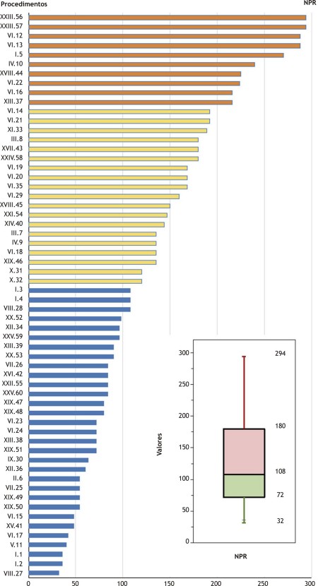 A distribuição dos valores obtidos para NPR foram plotados em um gráfico Box-Plot (inserido na Figura), no qual se visualiza a mediana (linha central) e os quartis. A metade dos modos de falha com NPR mais altos (acima da mediana de 108) compreendeu a variação mais alta do conjunto de dados, numa razão de 2:1 comparativamente à variação dos NPR dos procedimentos abaixo da mediana. As etapas no quartil superior abrangem 15 modos de falha relacionados aos maiores NPR, e que também compreendem uma maior dispersão dos dados, produzindo também uma variação mais ampla no conjunto deles, conforme alinhados de maneira decrescente na Figura. Neste conjunto de valores, dez procedimentos com NPR > 200 (17% do total de procedimentos) seriam merecedores de maior atenção durante a execução do estudo clínico, já que incorporam maiores riscos.