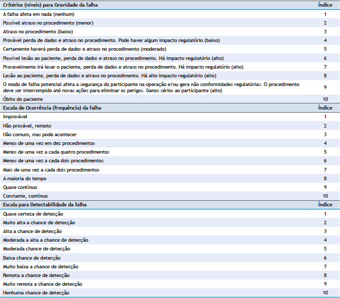 Em seguida, a construção da FMEA caracterizada para o caso em estudo teve base nas três matrizes de critérios de abordagem das falhas: Gravidade, Ocorrência (frequência) e Detectabilidade (possibilidade de ser detectada). Dentro de cada critério, as falhas são equacionadas e valoradas segundo pontuação entre 1 e 10. Para a Gravidade da falha, o valor 1 representa um risco inócuo e o valor 10 pode significar lesão ao participante ou mesmo o seu óbito. Na escala de Ocorrência, quanto mais o valor se aproxima de 10, maior a possibilidade de ocorrer o modo de falha. De tendência inversa, o valor 1 para Detectabilidade representa a maior probabilidade de se detectar a causa e/ou modo de falha antes ou durante a realização do procedimento e o valor 10 corresponde à impossibilidade de sua detecção no processo. A caracterização da FMEA está apresentada na Tabela 1. Este processo foi realizado em sessões de brainstorming com a equipe de profissionais envolvida no estudo: duas coordenadoras, uma médica, uma farmacêutica, duas enfermeiras e uma técnica de enfermagem.
