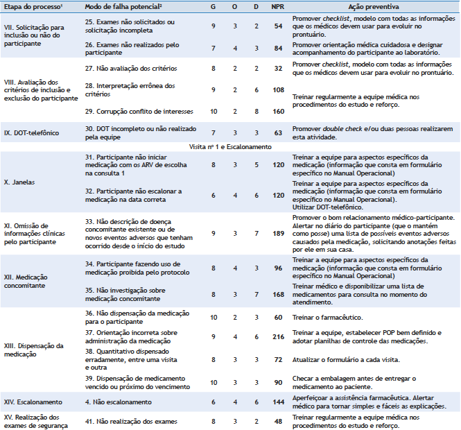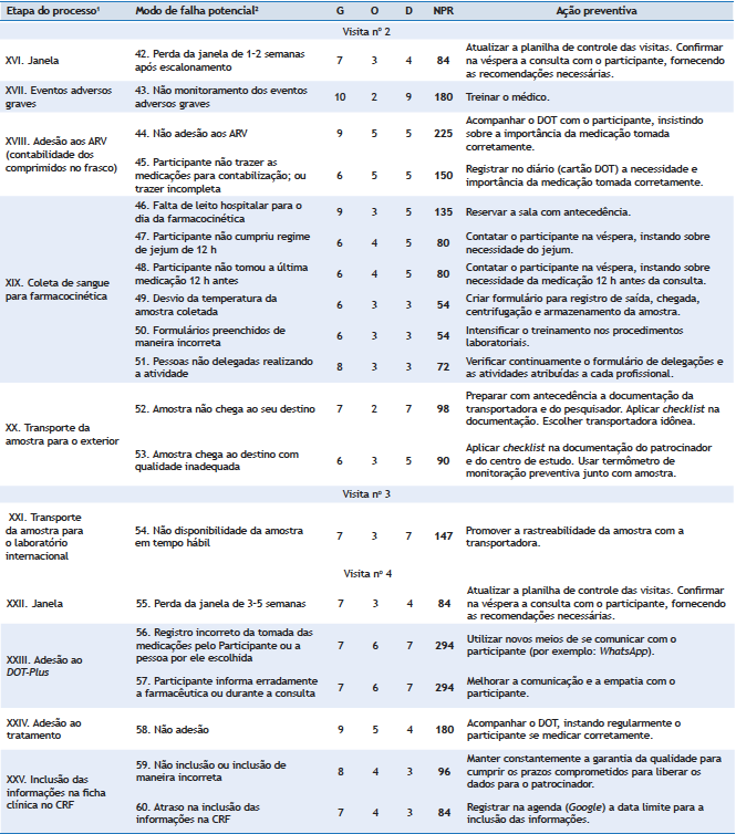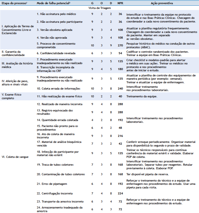 As etapas envolvendo coleta de sangue na visita de triagem (procedimento da etapa VI) e durante os testes farmacocinéticos (procedimento da etapa XIX) possuem 13 e 6 modos de falhas, respectivamente. No primeiro caso, os valores de NPR variam entre 42 e 288, e no segundo caso, entre 54 e 135, revelando diferenças qualitativas relevantes. Assim, múltiplas origens de potenciais falhas, associadas a uma mesma etapa, podem representar diferentes potenciais de riscos, a depender do consenso dos especialistas durante o processo de valoração e geração do NPR. Adicionalmente, algumas operações se repetem durante diferentes visitas do participante, podendo gerar diferentes valores de NPR. Por exemplo: a falha associada ao registro equivocado dos resultados da coleta de sangue acarreta um alto risco no início do estudo (NPR máximo = 288, falhas VI.12 e VI.13), mas apenas moderado no estágio da farmacocinética (NPR máximo = 180, falha XIX.46). Ainda, o menor número de modos de falhas não implica simplesmente em menor ou maior risco para determinada etapa. Por exemplo: no processo estruturado por visitas, existem seis etapas com apenas 1 modo de falha apontado (II.6, IX.30, XVI.42, XXII.55, XVII.43, XXI.55 e XXIV.58 na Tabela 2), com NPR variando entre 54 e 180, representando riscos relativamente baixo e médio. Na prática, é importante considerar os riscos intermediários mais próximos de NPR 200 (utilizado como número de corte para efeito de análise) também como geradores de falhas relevantes.