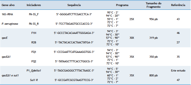 A mistura da PCR teve o volume final de 50 µL contendo os seguintes reagentes: 50 ng de DNA molde, 50 pmol de cada iniciador (Tabela 1), 0,2 mmol.l-1 de cada dNTP, 1X PCR buffer (pH 9,0), 1,5 mmol.l-1 MgCl2 e 1U de Taq Platinum DNA Polymerase (Invitrogen). Os programas utilizados para cada iniciador estão descritos na Tabela 1. Foi utilizada como controle positivo do gene qacE∆1, P. aeruginosa 531-9527(Genbank GU182337). O produto da PCR foi analisado em gel de eletroforese por 1 h a 50 V em gel de agarose 1% no tampão Tris-Borato-EDTA (TBE) 0,5X, que foi corado com brometo de etídio (3 mg/mL). Utilizou-se o 100 bp DNA ladder (Invitrogen) como padrão de peso molecular. Após a eletroforese, a imagem do gel foi realizada usando-se o software de vídeo documentação ImageQuant 300 (GE Healthcare).