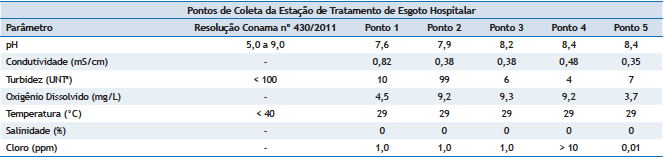 O pH das amostras apresentou variação entre 7,6 e 8,4. A condutividade variou entre 0,82 mS/cm e 0,35 mS/cm. O índice de turbidez apresentou maior índice no ponto 2 (99 UNT) em face da injeção de O2 e o índice de oxigênio dissolvido (DO) iniciou em 4,5 mg/L, posteriormente manteve índices entre 9,2–9,3 mg/L e reduziu para 3,7 mg/L no efluente tratado. A concentração de cloro ativo iniciou em 1,0 ppm, e teve um aumento significativo no ponto onde houve a adição do composto químico. A temperatura e o nível de salinidade permaneceram iguais em todos os pontos (Tabela 2).