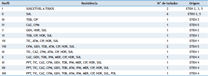 O perfil de suscetibilidade aos antibióticos foi determinado pela técnica de disco-difusão (método de Kirby-Bauer), segundo os critérios estabelecidos pelo Clinical Laboratory Standards Institute (CLSI)44. A turvação das suspensões utilizadas para testes de sensibilidade foi ajustada em solução salina estéril (NaCl 0,85%) para a obtenção do padrão de turbidez 0,5 na escala de McFarland e foram inoculadas em meio ágar Mueller-Hinton (DIFCO). Os isolados obtidos foram testados quanto à resistência frente a 13 antimicrobianos (CEFAR®). Os antibióticos empregados foram os seguintes: Piperacilina/tazobactam (PPT-110 µg), ticarcilina/ácido clavulânico (TIC-85 µg), ceftazidima (CAZ-30 µg), cefepime (CPM-30 µg), imipenem (IPM-10 µg), meropem (MER-10 µg), aztreonam (ATM-30 µg), gentamicina (GEN-10 µg), tobramicina (TOB-10 µg), sulfonamida (SUL-300 µg), ciprofloxacina (CIP-5 µg), norfloxacina (NOR-10 µg) e polimixina B (POL-300 UI). O controle de qualidade dos discos de antibióticos foi realizado usando-se as cepas de referência P. aeruginosa INCQS 00099 (ATCC 853), Staphylococcus aureus INCQS 00015 (ATCC 25923) e E. coli INCQS 00033 (ATCC 25922). Foram estabelecidos três padrões de resistência (Sensível – S, Resistente – R e Multidroga resistente - MDR) para os isolados analisados45.