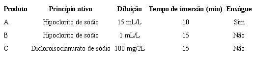 As amostras de alface utilizadas como teste de eficácia dos saneantes foram selecionadas uma a uma, desprezando-se as unidades danificadas e lavadas em água potável corrente para remover as impurezas da superfície, seguida da separação em três diferentes béqueres para os processos de sanitização. Em cada um deles a amostra foi tratada (seguindo a instrução do fabricante - Tabela 1) com saneantes comerciais, sendo eles denominados A, B e C no presente estudo. Os saneantes A e B eram compostos basicamente de hipoclorito de sódio e o saneante C era composto de dicloro isocianurato de sódio. Como amostra controle, também foram realizadas análises microbiológicas das amostras de alface sem lavagem para determinação da carga microbiana inicial.