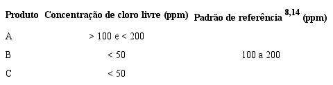 Os resultados dos testes de concentração de cloro livre dos saneantes estão expressos na Tabela 2. Todos os lotes de cada saneante analisado apresentaram os mesmos resultados quanto à concentração de cloro livre. Além disso, apenas o saneante A obteve concentração de cloro livre entre 100 e 200 ppm, estando, portanto, dentro da recomendação de 100 a 200 ppm 8, 14.