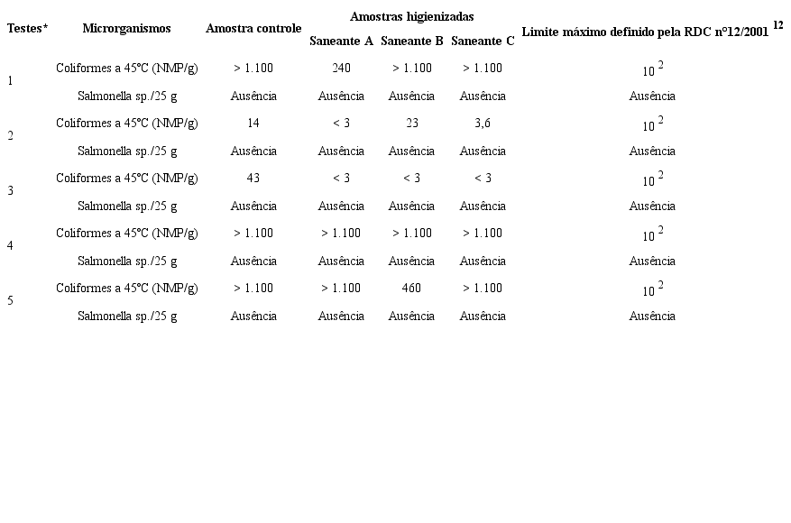 Os resultados das análises microbiológicas mostraram que 40% das amostras de alface controle apresentaram carga microbiana inicial baixa e, após higienizadas, permaneceram com valores de acordo com os padrões legais vigentes 12. No entanto, 60% das amostras não tiveram redução de coliformes a 45ºC a níveis aceitáveis para que o produto estivesse em condições sanitárias satisfatórias e, portanto, próprio para o consumo ( Tabela 3).