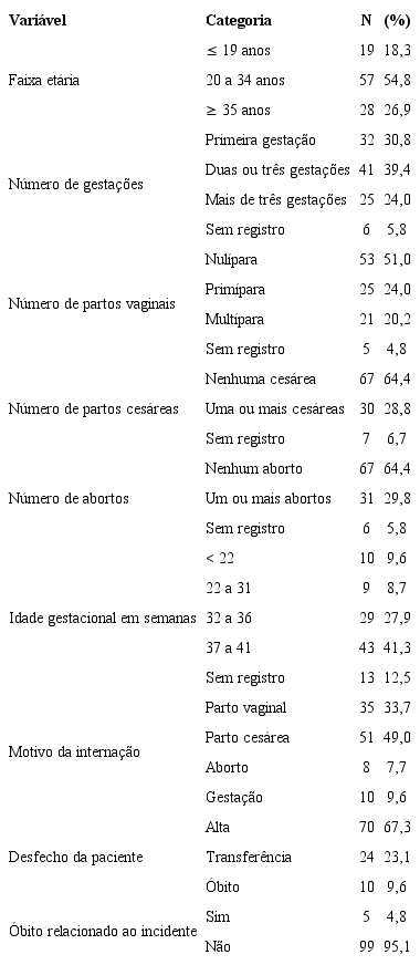 No período estudado, houve 9.323 partos, 48,6% partos cesáreas e 51,3% partos normais, com média de 310 partos/mês e 3.729 partos/ano. Foram notificados 114 incidentes no período, dos quais 104 envolveram pacientes, equivalendo a 1,1% do total de mulheres atendidas no período. Os outros dez incidentes foram circunstâncias notificadas com potencial risco de EA, porém não atingiram nenhuma paciente, por isso a discrepância entre o número de pacientes e o de incidentes no estudo.