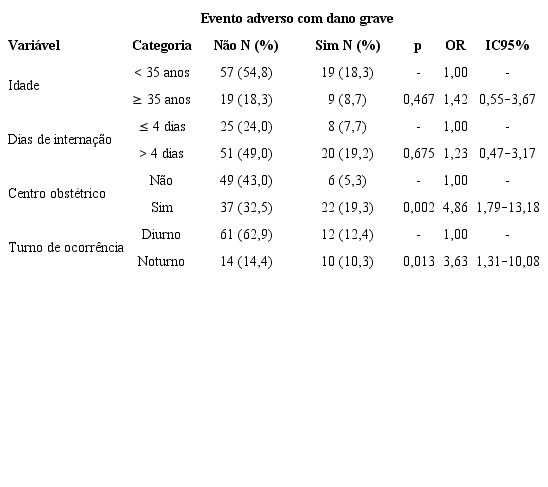 Resultados: Foram notificados 114 incidentes, sendo que 104 ocorreram com pacientes e resultaram em danos leves (16,7%), moderados (32,5%) e graves (24,5%), com 4,8% de óbitos relacionados ao incidente. A maioria dos incidentes ocorreu durante o dia (75,3%), no centro obstétrico (51,7%), por notificação de enfermeiros (57,0%) e foram relacionados aos procedimentos de assistência à saúde (48,3%). Os eventos adversos graves apresentaram maior chance de ocorrer no centro obstétrico (OR = 3,86; IC95% 1,26–11,84) e no período noturno (OR = 3,37; IC95% 1,16–9,75).