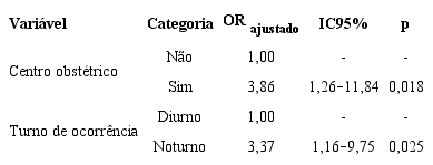 No modelo simples da regressão logística, observou-se associação estatisticamente significativa entre a ocorrência do EA com dano grave e o CO como local do evento (p = 0,002) e o turno noturno (p = 0,013) ( Tabela 3). Essas variáveis permaneceram associadas ao EA com dano grave no modelo de regressão logística múltiplo, apontando três vezes mais chance desse evento ocorrer durante o período noturno e no CO ( Tabela 4).