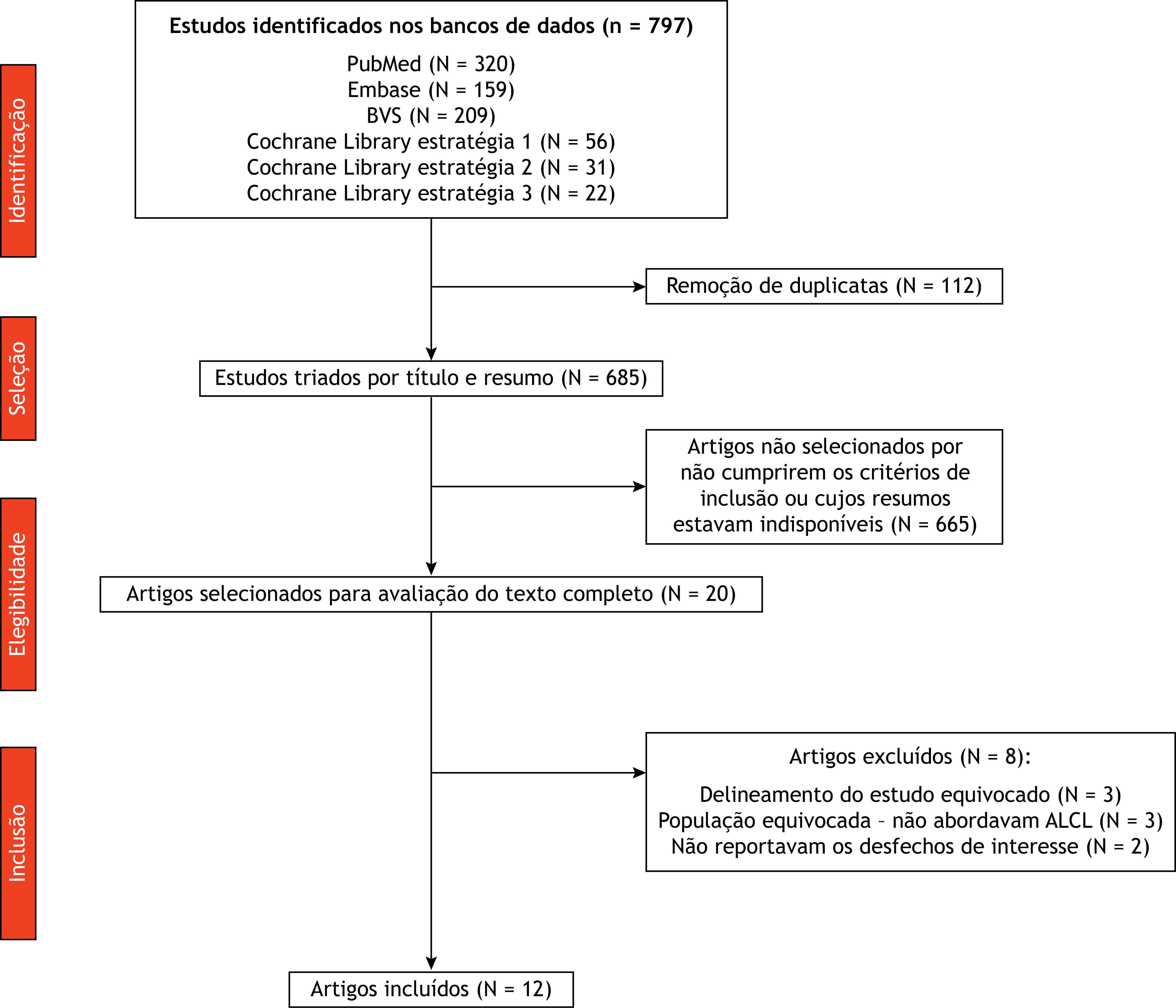 A pesquisa da literatura recuperou 797 estudos, dos quais 112 eram duplicatas. Dessa forma, 685 estudos foram triados por título e resumo segundo os critérios de elegibilidade acima apontados. Desses, 20 seguiram para fase de leitura do texto completo. Os artigos que apresentavam potencial de elegibilidade, mas que não tiveram seus resumos ou textos completos obtidos, foram excluídos desta revisão. O total de 12 estudos atenderam a todos os critérios de inclusão estabelecidos. Os detalhes do processo de seleção e os motivos para exclusão estão ilustrados na Figura .