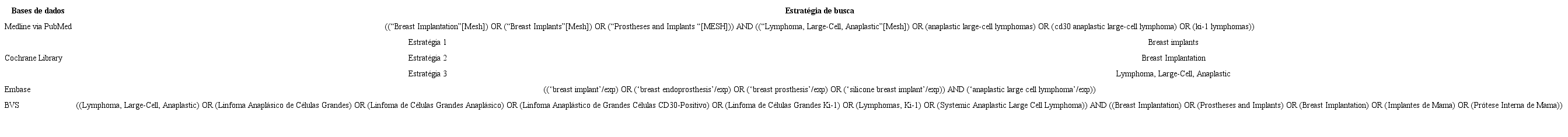 Para tanto, em fevereiro de 2019, foram feitas buscas estruturadas, conforme Tabela 1 , nas bases de dados: Medline (via PubMed), Cochrane Library, Embase e Biblioteca Virtual em Saúde (BVS).