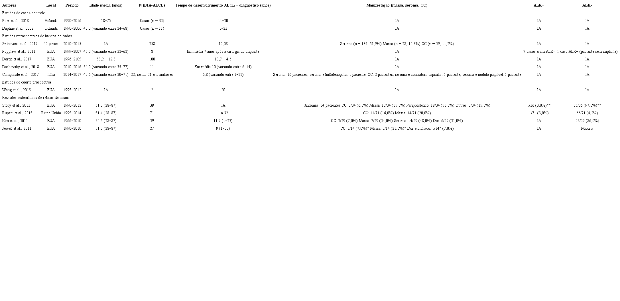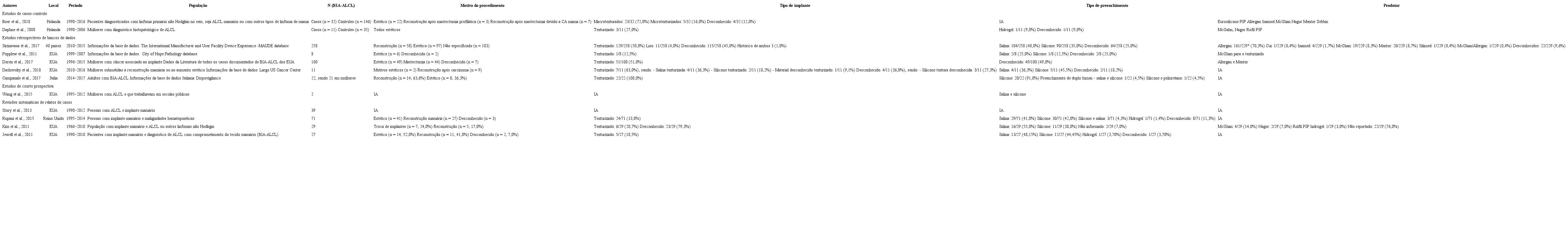 O estudo de Kim et al. 18 analisou relatos de casos notificados de linfoma não Hodgkin em pacientes com implantes mamários. As buscas foram realizadas nas bases de dados PubMed, Embase e Web of Science . Trinta e quatro artigos foram incluídos no estudo, reportando 36 casos de linfoma não Hodgkin em pacientes com implantes mamários, dos quais 29 (81,0%) eram ALCL.