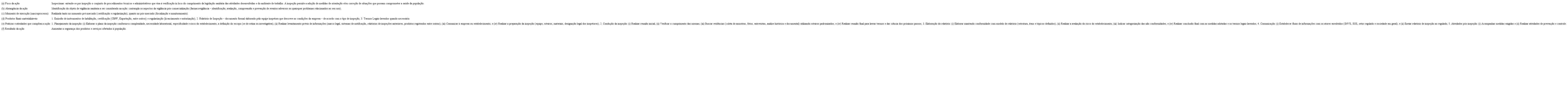 As ações críticas foram detalhadas em relação aos resultados esperados das mesmas, os produtos obtidos com a sua realização, as práticas associadas à sua realização e as atividades que compõe cada prática de Visa. Esses descritores foram compostos pelos seguintes elementos: (a) foco da ação; (b) abrangência da ação; (c) momento de execução [macroprocesso]; (d) produtos finais materializáveis; (e) práticas e atividades que compõem a ação; (f) resultado da ação ( Quadro 1).