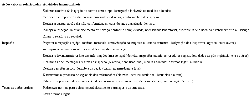 Resultados: Foram indicadas 12 ações críticas, sendo que nove delas estavam relacionadas à ação de inspeção. A categorização das ações críticas considerou: foco e abrangência da ação; momento de execução; produtos finais materializáveis; práticas e atividades que compõem a ação; e os resultados esperados. As práticas a serem harmonizadas foram priorizadas e detalhadas quanto aos requisitos a serem atendidos para a execução pela Vigilância Sanitária: legais; cognitivos; éticos; logísticos; e estruturantes para subsidiar o processo de descentralização de ações.