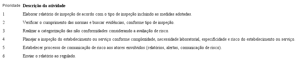 Vale destacar que, como resultado da priorização das atividades de inspeção desenvolvidas pelos agentes de Vigilância Sanitária, houve consenso entre os participantes em destacar as atividades de elaboração do relatório de inspeção, verificação do cumprimento das normas e realização da categorização das não conformidades considerando a avaliação de risco como atividades que impactam diretamente na atuação do fiscal como poder de polícia e que, portanto, não podem ter grande variabilidade na forma de sua execução nem serem calcados na subjetividade de julgamento.