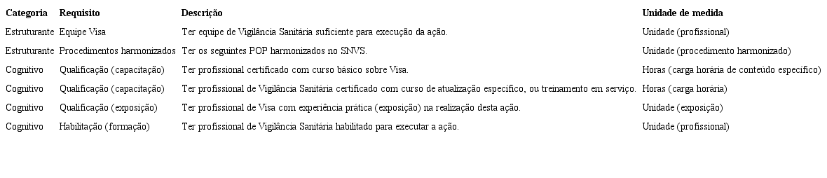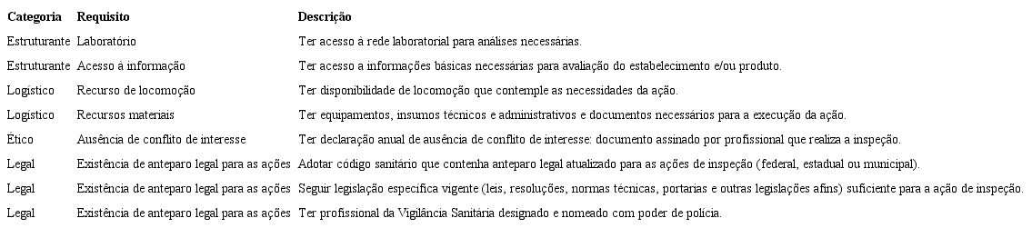 No desenvolvimento das discussões, identificou-se que algumas condições de execução são gerais para todas as ações de Visa, críticas ou não, e, portanto, consideradas como condição limitante para que uma Vigilância Sanitária possa assumir a responsabilidade pela execução de qualquer ação. Com este entendimento, estes fatores foram considerados como requisitos gerais no campo legal, ético, logístico e estruturante ( Quadro 4). Os requisitos específicos centraram-se nas categorias estruturante e cognitivo ( Quadro 5).