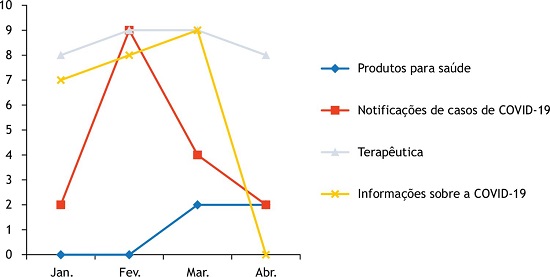 Ao segmentar as fake news em quatro grupos, pode-se obter um número de notícias igual a quatro para “Produtos para saúde”, 17 para “Notificações de casos”, 34 sobre “Terapêutica” e 24 para “Informações sobre o COVID-19”. A distribuição da frequência destas notícias em função da sua distribuição ao longo dos meses de janeiro a maio pode ser visualizada na Figura 1.