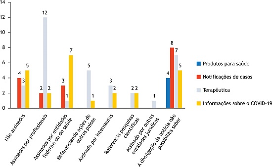 Conclusões: As notícias sobre a COVID-19 devem ser avaliadas de forma crítica e deve-se atentar principalmente a notícias sobre terapêuticas e/ou veiculações assinadas por profissionais da área da saúde.