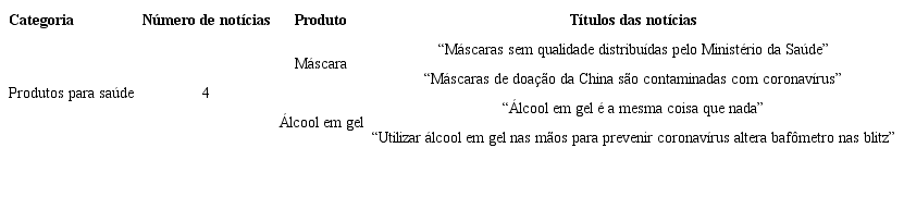 O primeiro grupo de análise, denominado “Produtos para saúde”, engloba notícias falsas acerca de produtos correlatos, que são definidos pela Agência Nacional de Vigilância Sanitária (Anvisa) como: equipamento, aparelho, material, artigo ou sistema de uso ou aplicação médica, odontológica ou laboratorial, destinado à prevenção, diagnóstico, tratamento, reabilitação ou anticoncepção e que não utiliza meio farmacológico, imunológico ou metabólico para realizar sua principal função em seres humanos, podendo entretanto ser auxiliado em suas funções por tais meios 7.