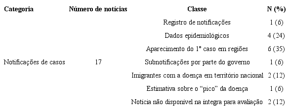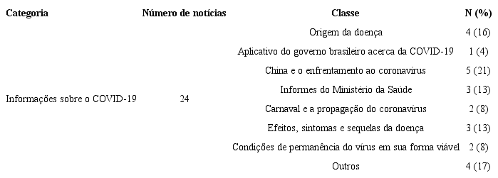 A última categorização, denominada “Informações sobre a COVID-19”, comportou as demais notícias acerca do tema. Dessa forma, foram abordadas temáticas sobre a origem e o curso da doença, sua sintomatologia, forma de disseminação e comportamento do vírus SARS-CoV-2.
